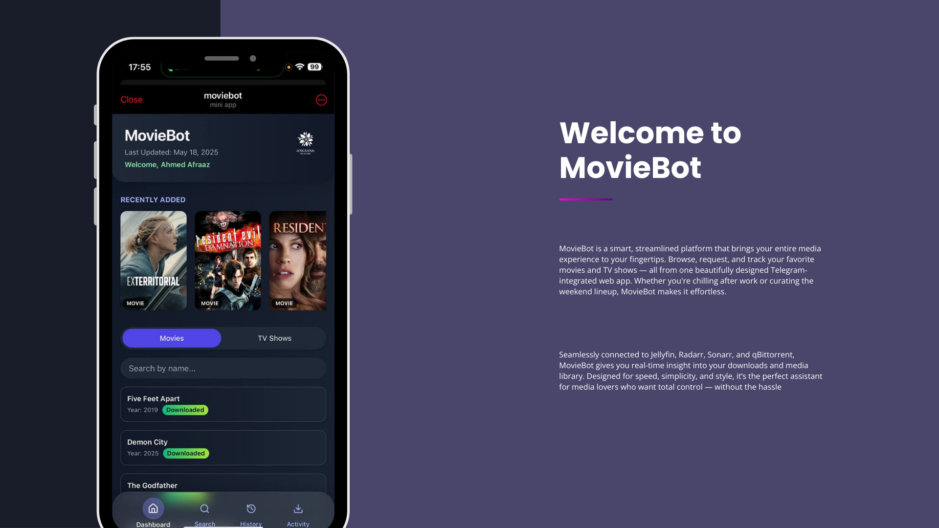 MovieBot is a Telegram-integrated platform for requesting movies and TV series, built for modern content enthusiasts. It seamlessly connects with Sonarr, Radarr, and qBittorrent to automate downloads and media library management.